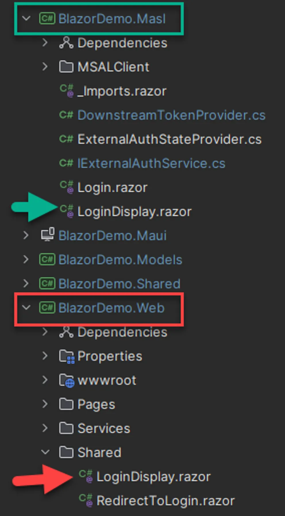 From the MainLayout.razor, we use the loader component to find a suitable LoginDisplay component to render. Which project is running will determine which component we get.